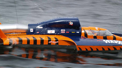 The real boat: The hull started its life in 1988 as the Holset Miss Madison, driven by Ron Snyder. But the driving duty was soon taken over by Mike Hanson. The boat went through a number of name/sponsor changes until Kellogg's stepped in as the main sponsor. When 1993 hit, the boys decided to do something radical with it, paint it like a tiger, and it worked! Everywhere the boat went, the crowds loved it, and you can see why. Its the most unique paintjob done on a boat. That struck a cord with the majority of fans. The boat is probably best known for the "Trailer start Win" in San Diego. Everyone in the heat either went dead or was penalized, showing that driving with your head is the right way to go. Also, a little luck doesn't hurt. In 1994 the boat got another new sponsor, DeWalt. Then went back to just "Miss Madison" until Oh Boy! Oberto began sponsoring it. The hulls last season was 2006. It was then replaced by the current Oberto. "The Old Girl" is still prepped as backup boat for the Oberto/Madison team.